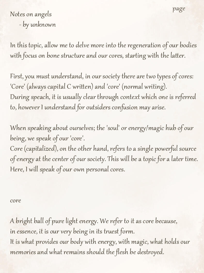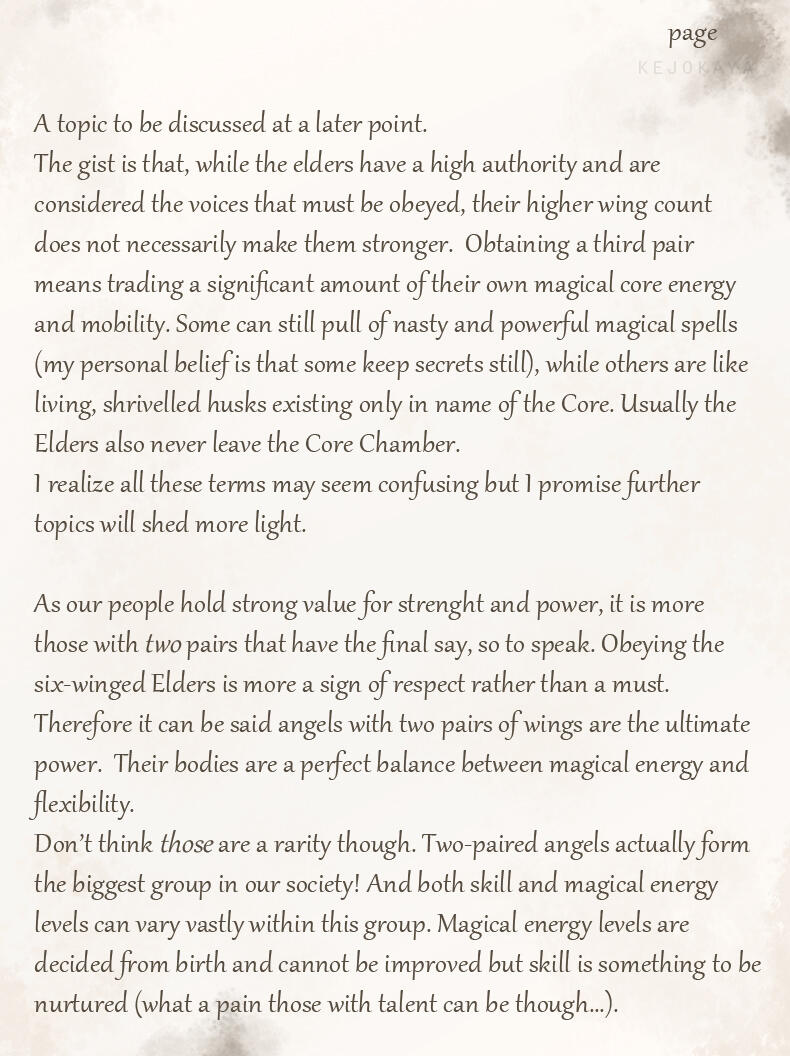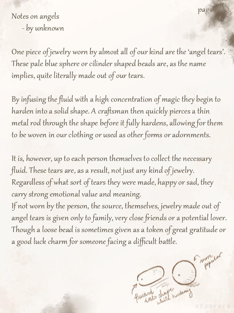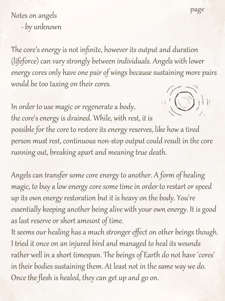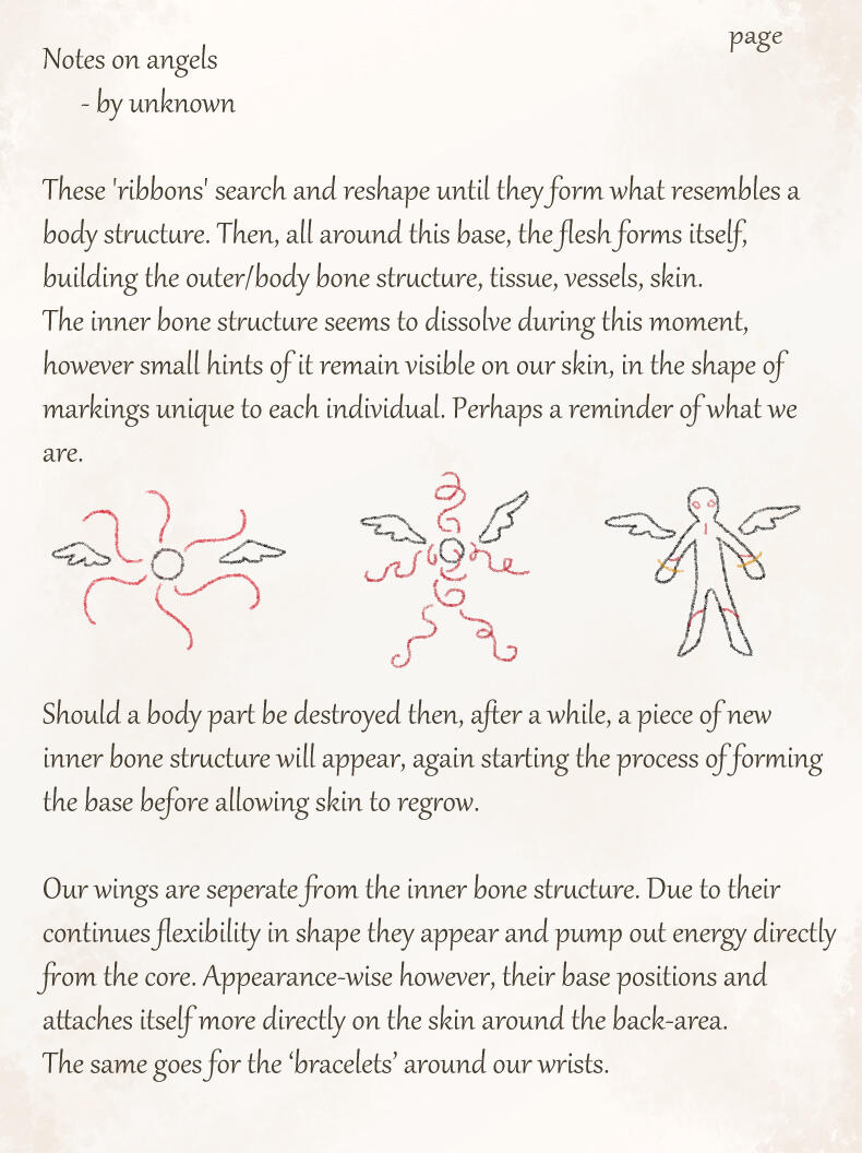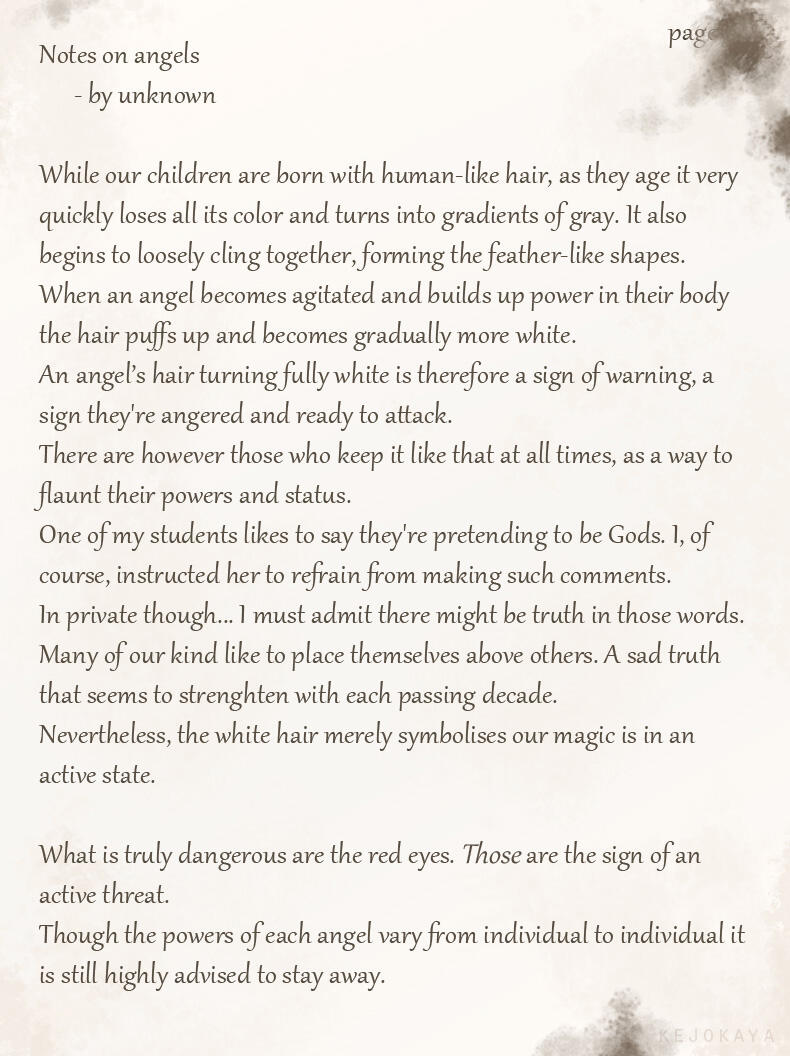 For lack of creativity or perhaps a feeling of superiority her race adapted these names as their own.While she's unsure whether or not her race is what humans originally saw as angels in the distant past, or if they are merely a mimicry of these angelic beings, she feels many humans have a much too gentle and pretty view of her people.