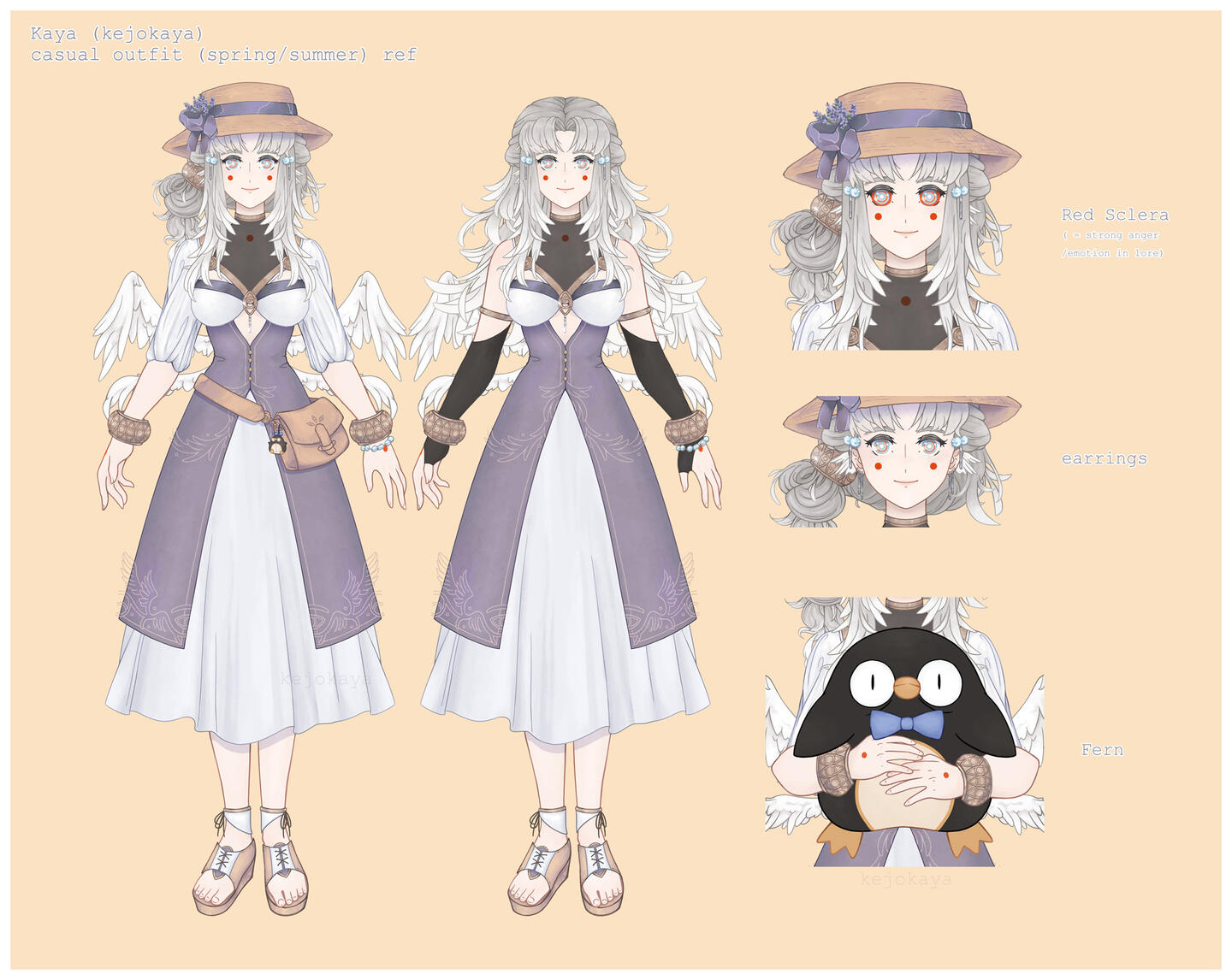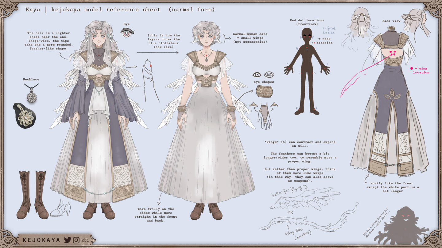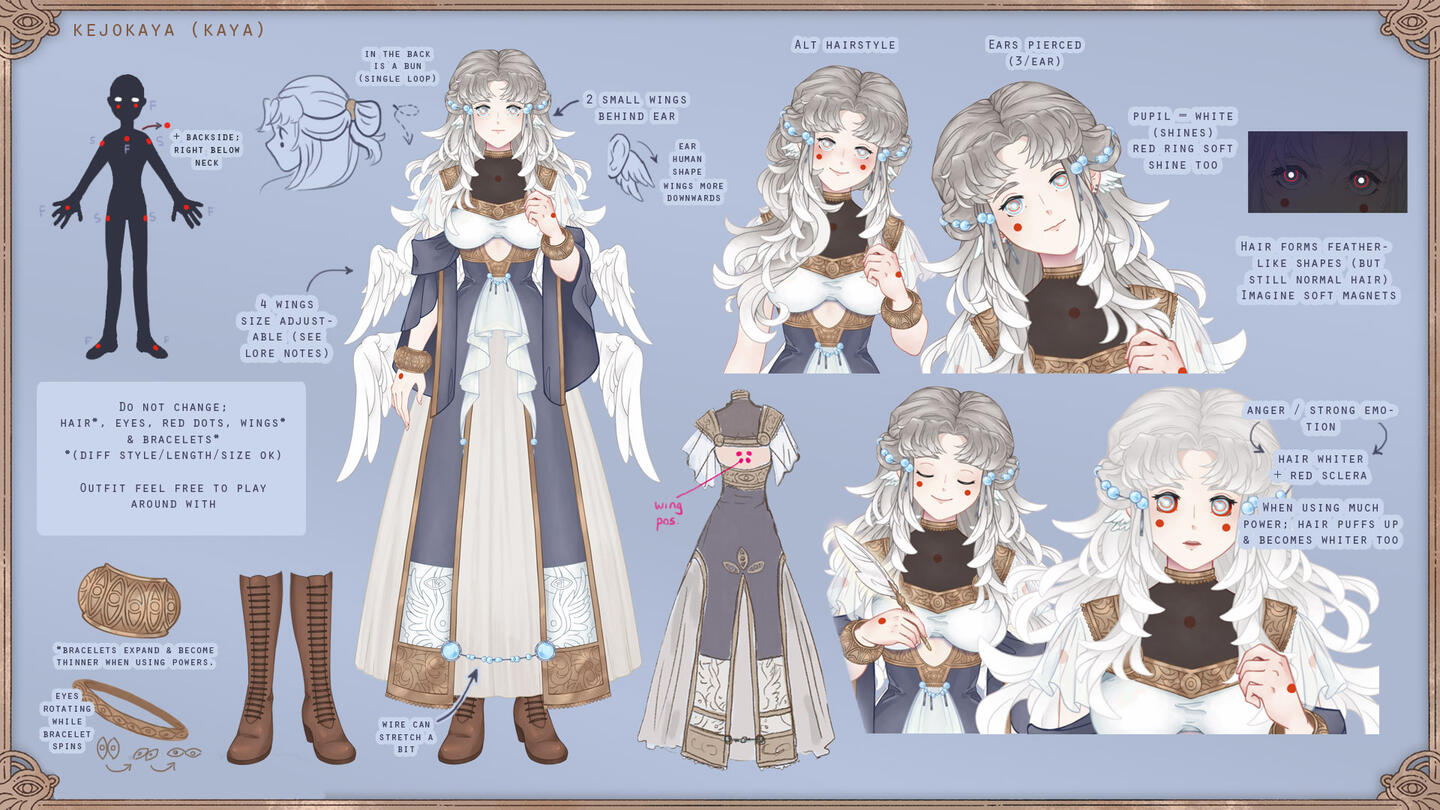 While I use my own name for this character and portray some of my own thoughts and habits onto her, this character is not a 1-to-1 perfect representation of my real self. Please keep this in mind and think of Kaya (the real human me) and this Kaya (the vtuber character) as seperate.--Kaya originally comes from 'Heaven's Palace', a group of floating, isolated islands and constructions in the sky, home to her race of angel-like beings ... or those are the terms she knows humans use at least.